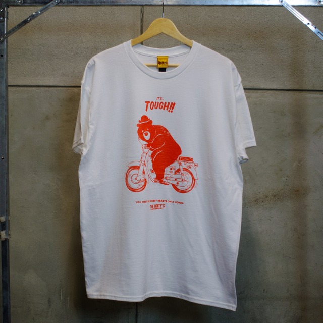 FLAT-1オリジナルブランド Hoity’s 「スーパーカブ」の名前の由来はご存知でしょうか? スーパーカブの「カブ」は英語で「猛獣(熊など)の子供」 という意味。 小さいエンジンでもパワーがあることをアピールするためにこのように命名されました。 今回はその名前の由来にちなんで カブと熊をモチーフに 60~70年代頃の架空のカブの広告を作ったら...というコンセプトで制作したイラストです。 かつてはサーカスなども盛んで、猿などにバイクを運転させている事例などもあります。 熊に三輪車を運転させているというコンテクストが存在しているので 遠心クラッチで誰でも操作がしやすい、というニュアンスもあり また、背の高い、ガタイの良い方がカブに乗る際によく聞く「サーカスの熊みたい」といったセリフの揶揄も含まれています。 イラストの雰囲気から、行灯カブをチョイスしました。 下に書いてある文言についての補足 “Nicest People”は60年代初頭にアメリカで行われていたキャンペーンで、「オートバイはアウトローの乗り物」といったイメージを大きく変え、誕生日やクリスマスプレゼントとして人気を集めるなど最も成功した広告だと言われています 当時はあの“Elvis Presley”もカブの広告に起用されていました! White x Burnt Orange Stone Blue x Chocolate の2色展開 ※フロント:胸 SIZE : 身丈/身幅/袖丈 M :68cm/50cm/19.5cm L : 71cm/52,5cm/20.5cm XL : 74cm/55cm/21.5cm ※写真と実物の色味が異なる場合がございます。 ※初期不良以外の返品・交換は対応できません。商品到着から1週間以内にお問い合わせください。 *お取り扱い注意事項* プリントは、永久的なものではありませんので、洗濯や着用をくり返すことにより、多少うすくなったり、ひび割れや、脱落を生じることがありますので、あらかじめ御了承下さい。\尚、プリント部分の揉み洗い、アイロンがけは、絶対にお避け下さい。 また、この製品は、縫製後、製品洗いをしております。その為、1枚1枚の色のでかた、風合い、サイズ等微妙に違いますが、これはこの加エの特徴です。他の製品では味わえない良さをお楽しみください。 お洗濯につきましては、液温は30℃を限度とし、洗濯機で非常に弱い洗濯が可能となっております。(クリーニングにつきましても、非常に弱いウェットクリーニングのみ可となっております。) 洗剤は必ず中性洗剤を使用して下さい。酸素系漂白剤及び、蛍光剤入りの洗剤を使用されますと、部分的に変色や、本来の色合いを失うことがあります。お洗濯は必ず短時間で処理し、つけ置き洗いや、濡れたままの放置は絶対にお避け下さい。洗濯後は形をととのえてすぐ干して下さい。素材の性質上、多少の縮みがあります。単独洗いにてお願い致します。この製品は、タンブラー乾燥の際、多少縮むことがあります。アイロンは、当て布をしてかけてください。濃色の製品は、色移りすることがあります。汗をかいたり、雨や水に濡れたままの長時間放置は避けてください。